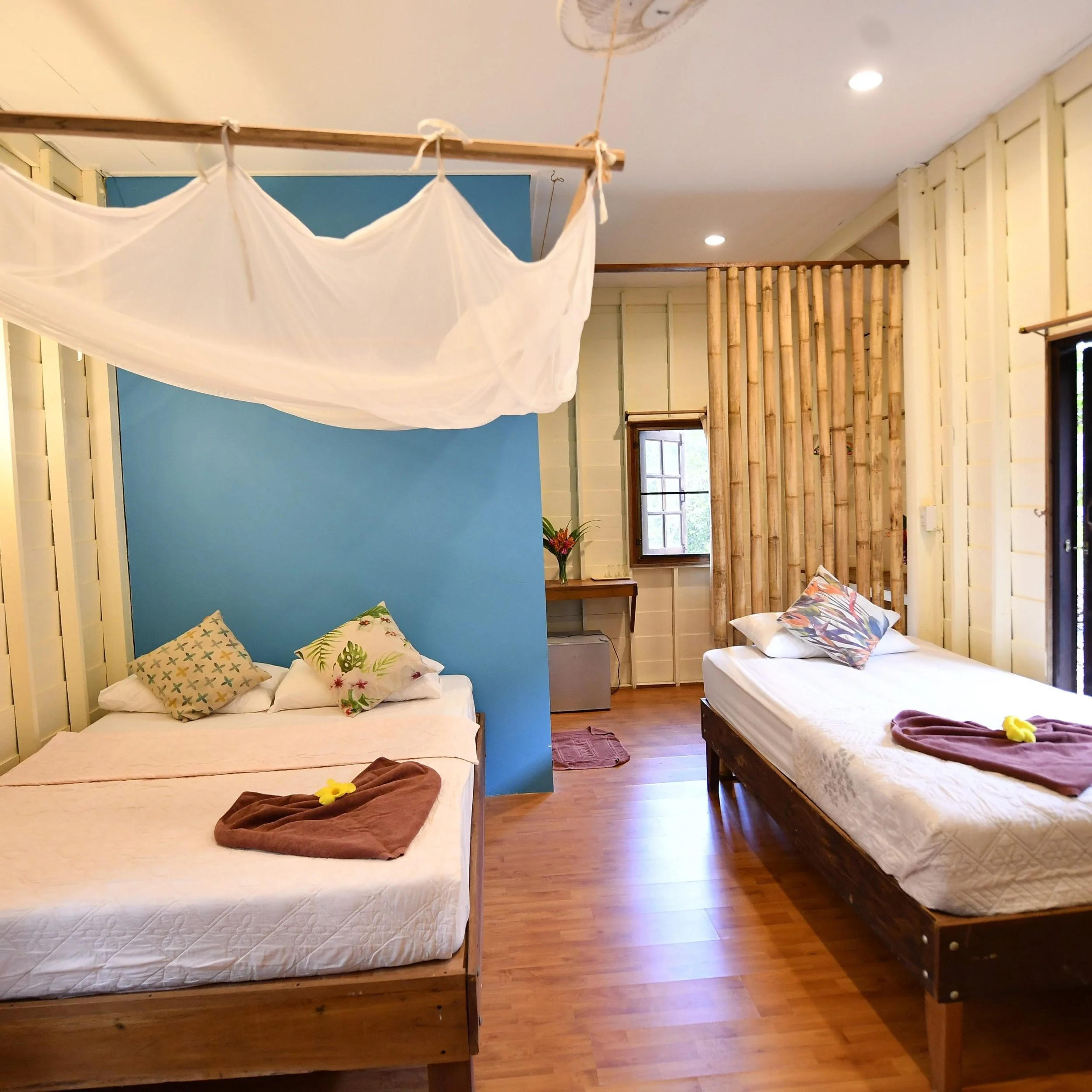 For the next option, we have a more comfortable room, a nice comfy bungalow with a queen-sized bed and an additional single bed, a comfortable ensuite with shower and a veranda with hammock. This room has no AC but a big Fan on the ceiling. You can treat yourself to a nice spacious room on your own, or share with a friend or partner.